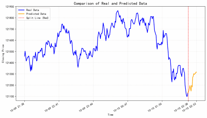 在预测分割线(红虚线)之前,比特币价格经历了剧烈的波动。在时间临近尾声时,市场出现一波快速的抛售,价格从大约 $12,140 一线迅速跌至**$12,110**左右的低点,显示出空头力量在极短时间内占据了主导地位。